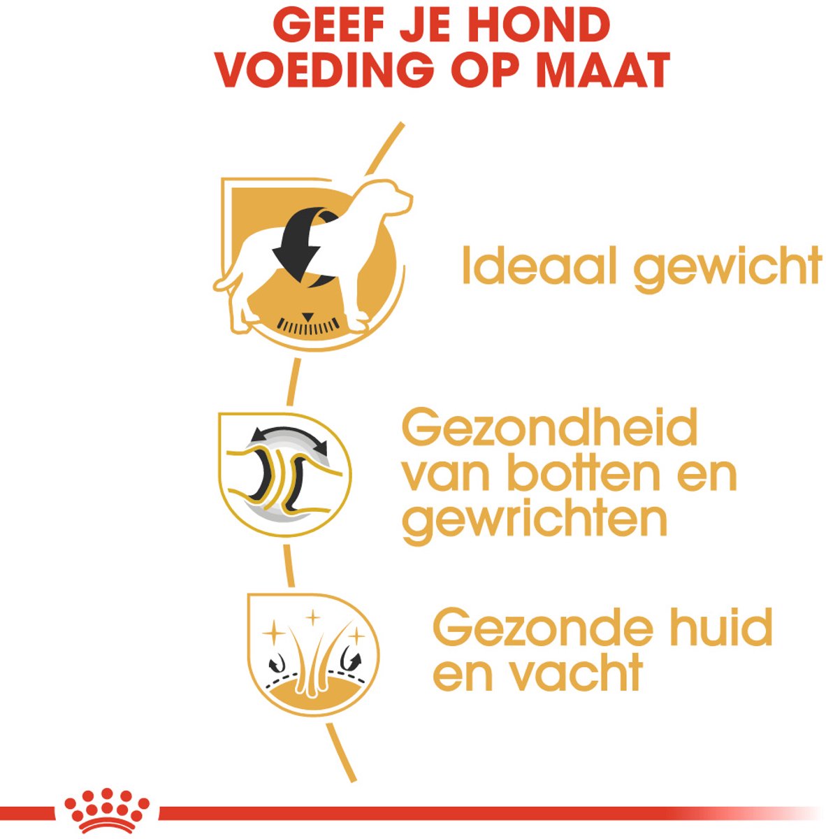 ROYAL CANIN® Golden Retriever Adult is geschikt voor golden retrievers van meer dan 15 maanden en is speciaal samengesteld om te voldoen aan de voedingsbehoeften van jouw volwassen hond. ROYAL CANIN® Golden Retriever Adult bevat omega 3-vetzuren, waaronder EPA en DHA, en bernagieolie. Deze voedingsstoffen helpen allemaal om een gezonde barrièrefunctie van de huid te ondersteunen, wat bevorderlijk is voor de gezondheid van de vacht van je hond. Dankzij de combinatie van vetzuren en de verrijking met taurine helpt ROYAL CANIN® Golden Retriever Adult ook een gezonde hartfunctie bij je hond ondersteunen. ROYAL CANIN® Golden Retriever Adult heeft een aangepast caloriegehalte, waardoor de voeding jouw golden retriever helpt om zijn ideale gewicht te behouden. Voorts is de brok van ROYAL CANIN® Golden Retriever Adult exclusief op maat gemaakt voor de golden retriever. De vorm en grootte van de brok zijn speciaal ontwikkeld om te voldoen aan de voorkeuren van dit specifieke hondenras.